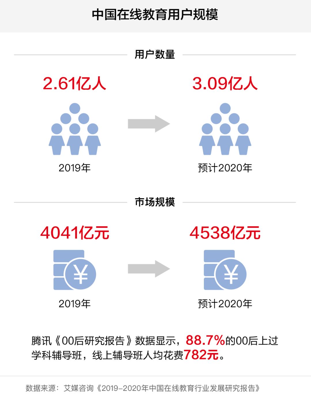 據(jù)艾傳媒咨詢《2019-2020中國在線教育產(chǎn)業(yè)發(fā)展研究報告》顯示,2019年中國在線教育用戶規(guī)模達到2.61億,市場規(guī)模達到4041億元。預計2020年中國在線教育用戶規(guī)模將達到3.09億。市場規(guī)模將達到4538億元,同比增長15.5%;騰訊《00后研究報告》顯示,88.7%的00后學生參加過學科輔導班,在線輔導班平均費用為782元。
