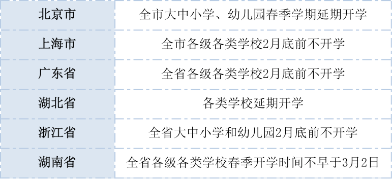部分省市推遲開學時間