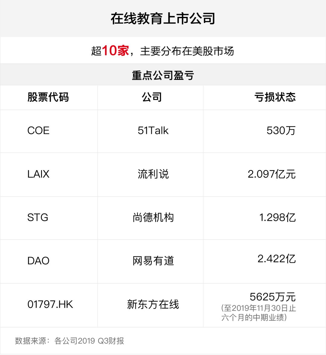 記者注意到,目前成功上市的網(wǎng)絡教育公司有10多家,大部分集中在美國股市。根據(jù)已公布的2019年第三季度財報顯示,流利談話、51Talk、尚德、新東方在線等知名公司均出現(xiàn)不同程度的虧損。